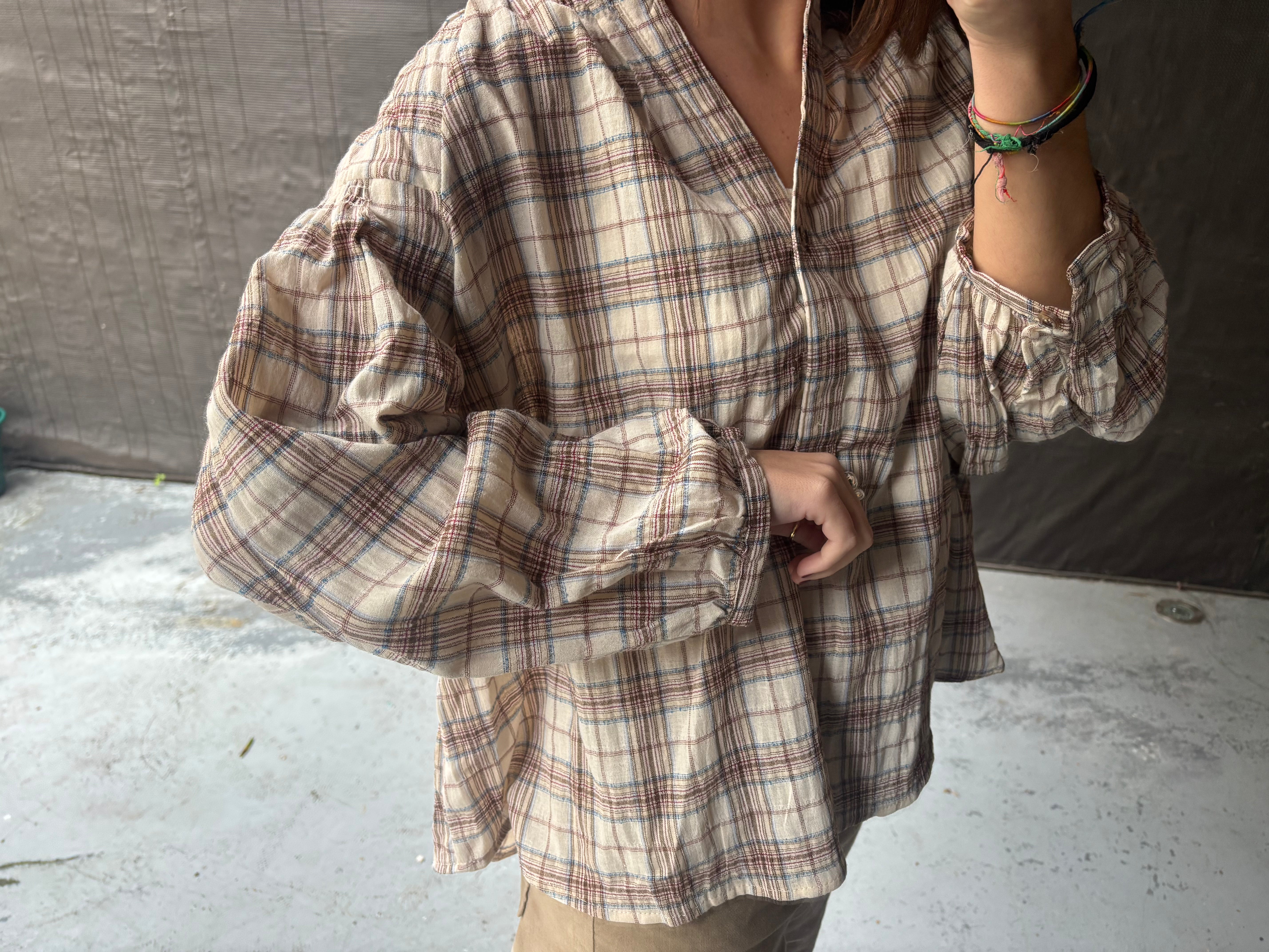 Camisa cuadros cuello subido - Beige