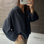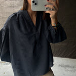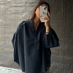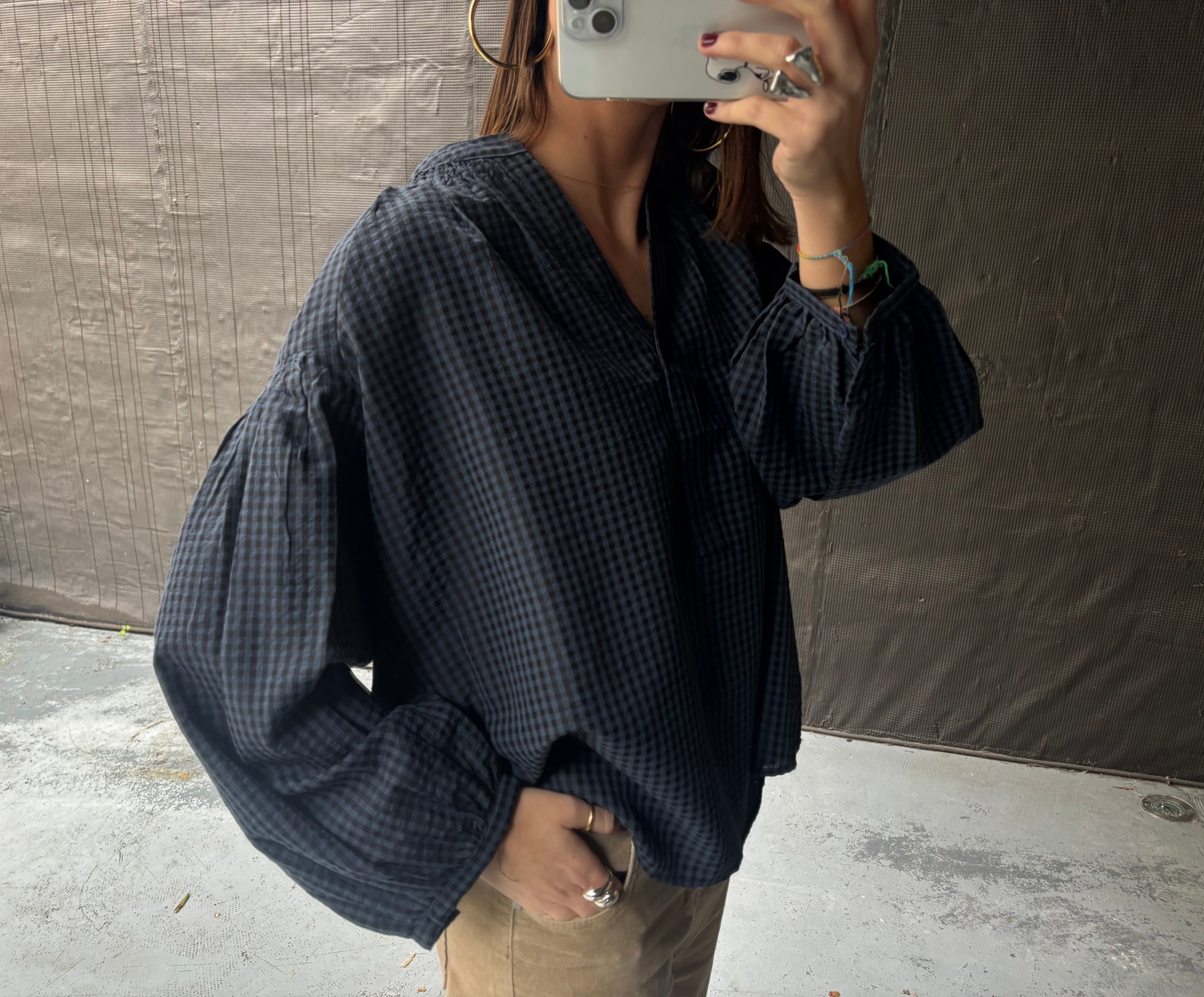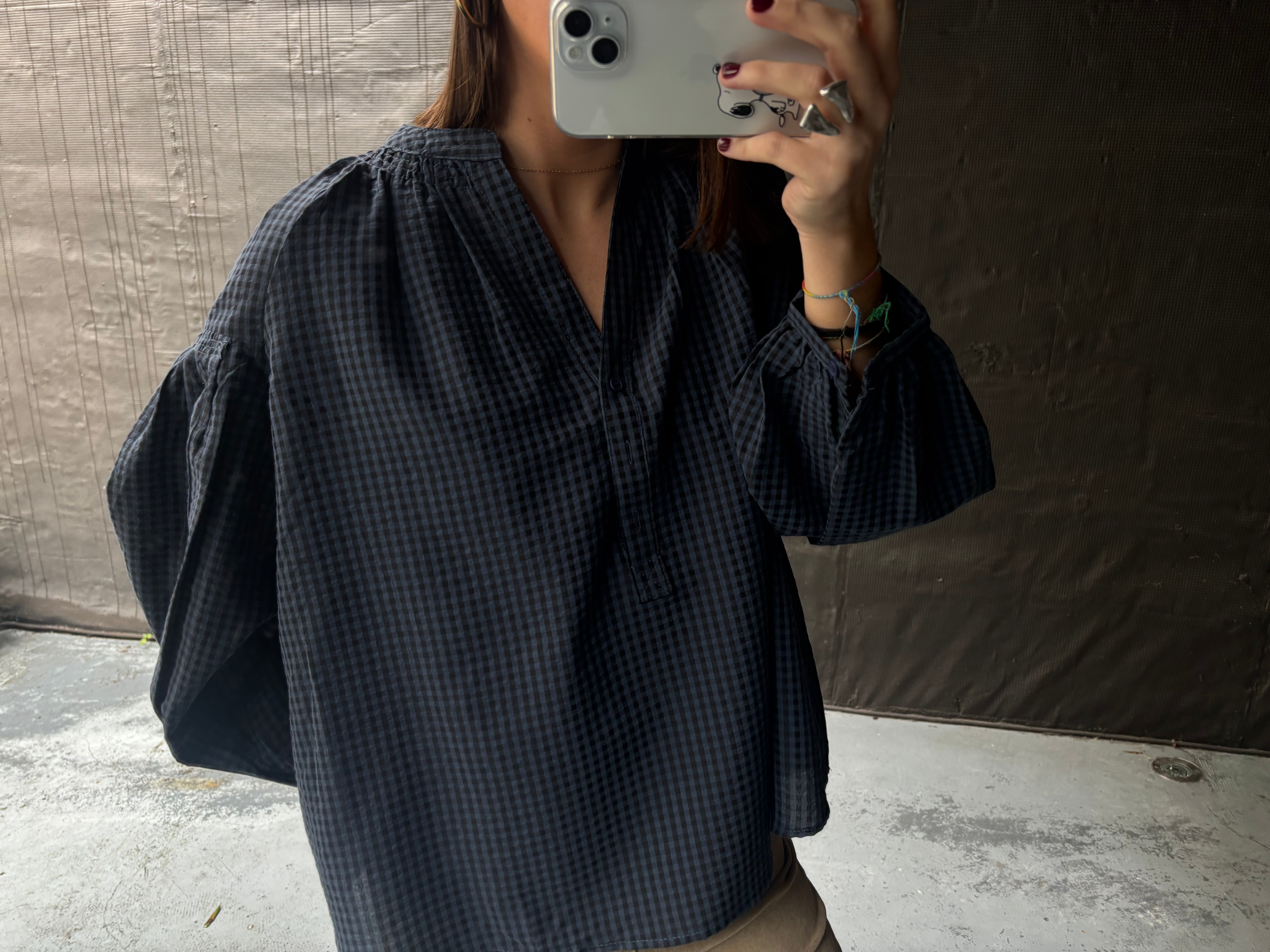 Blusa algodón cuello pico. Cuadros en azul y negro.