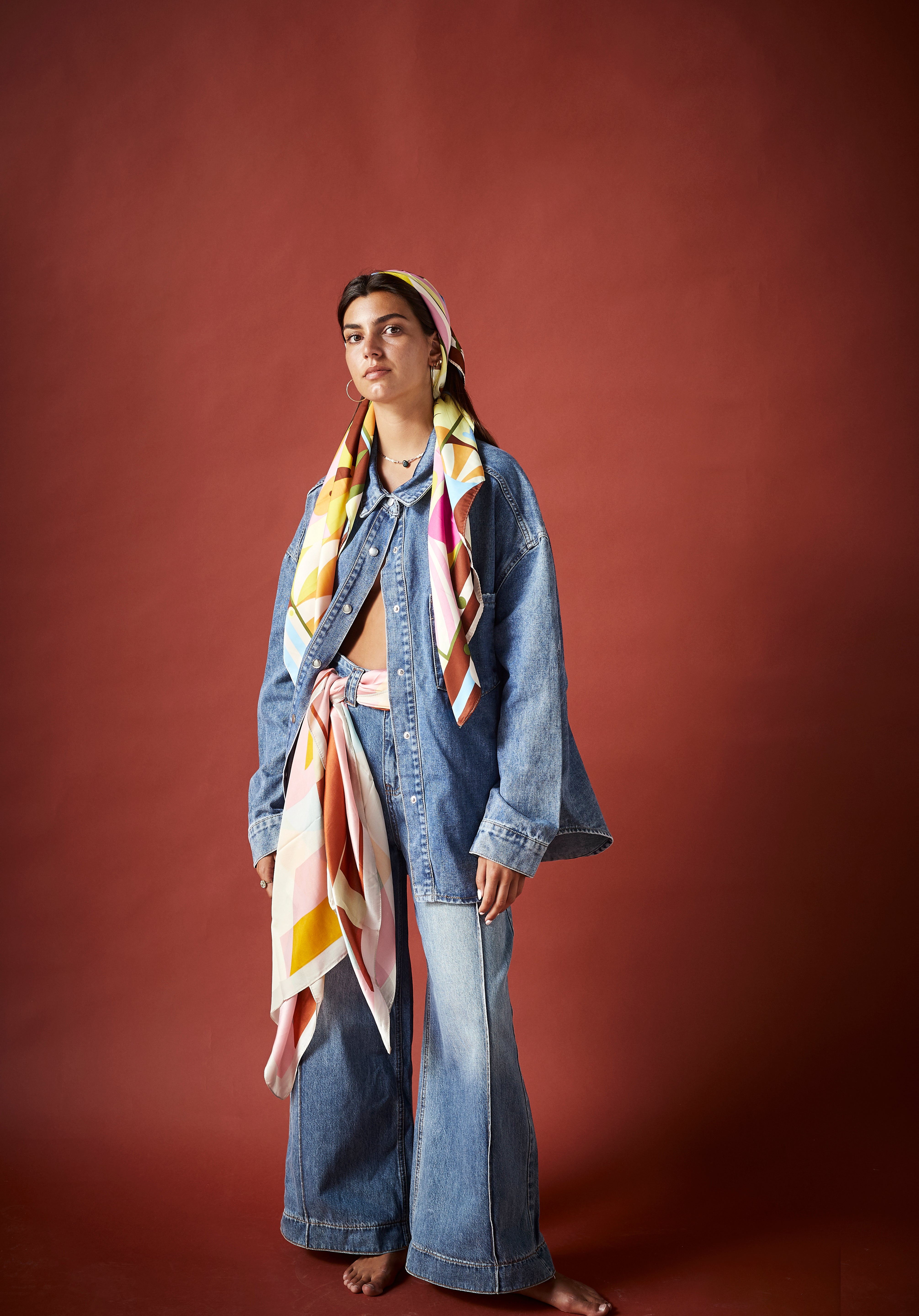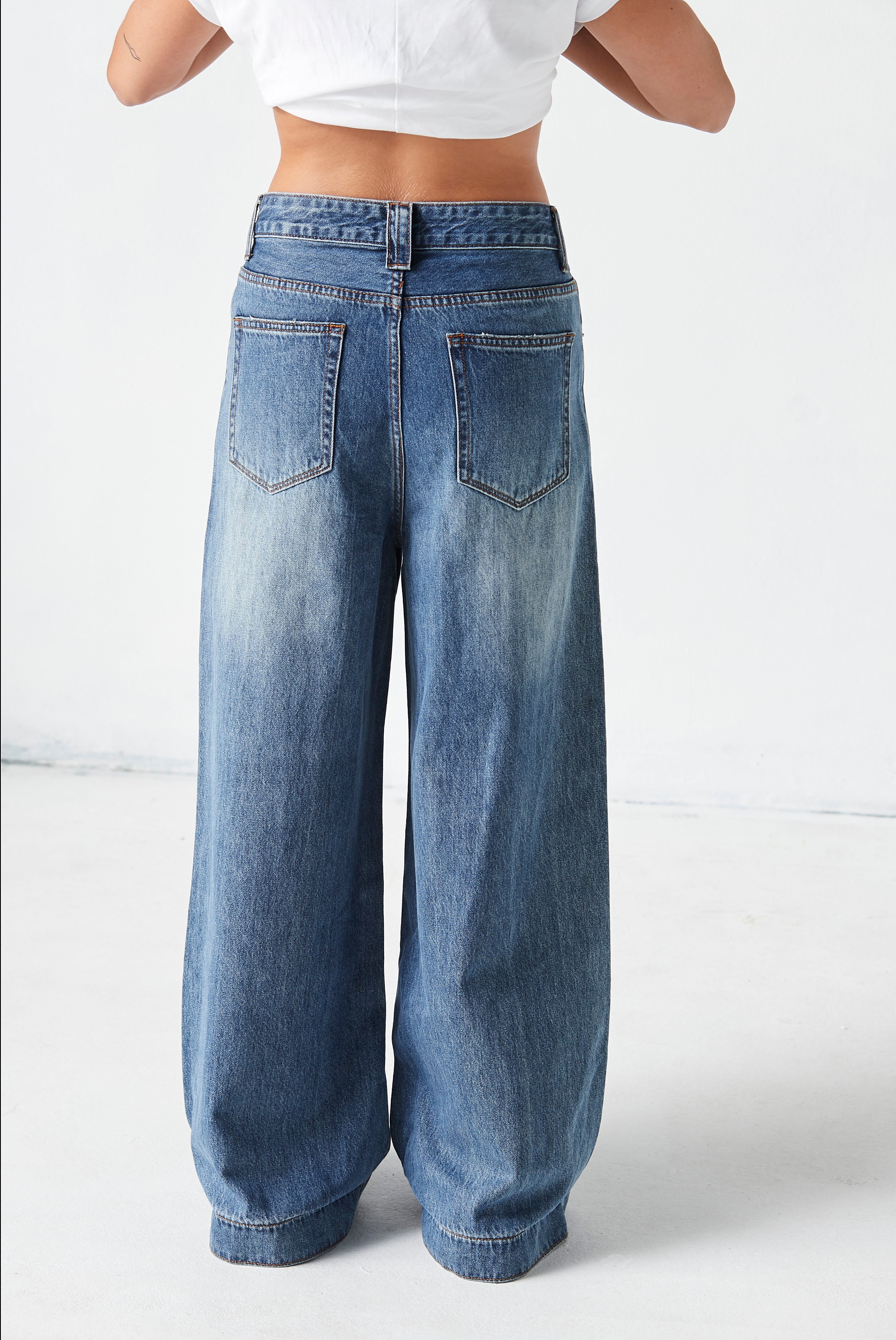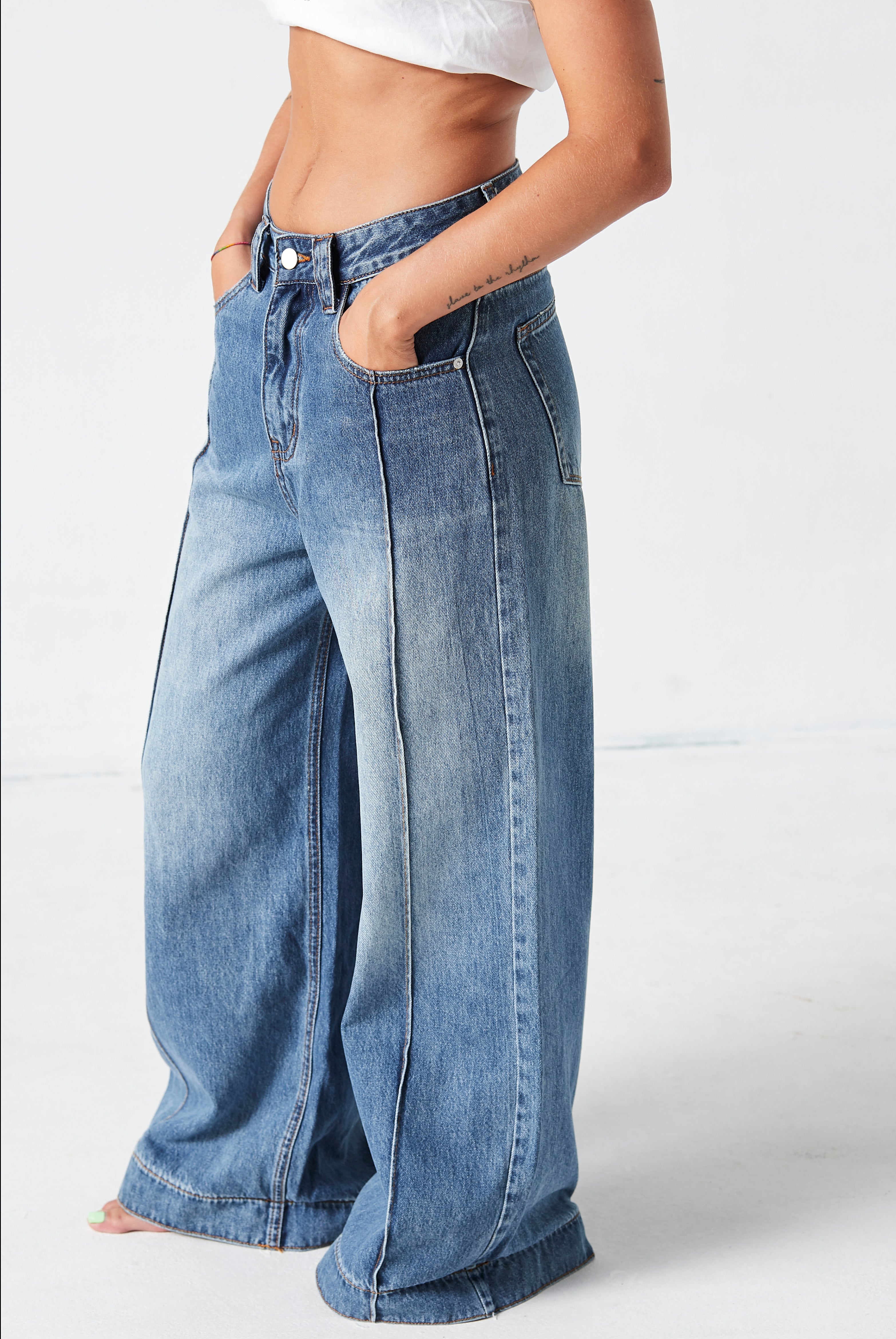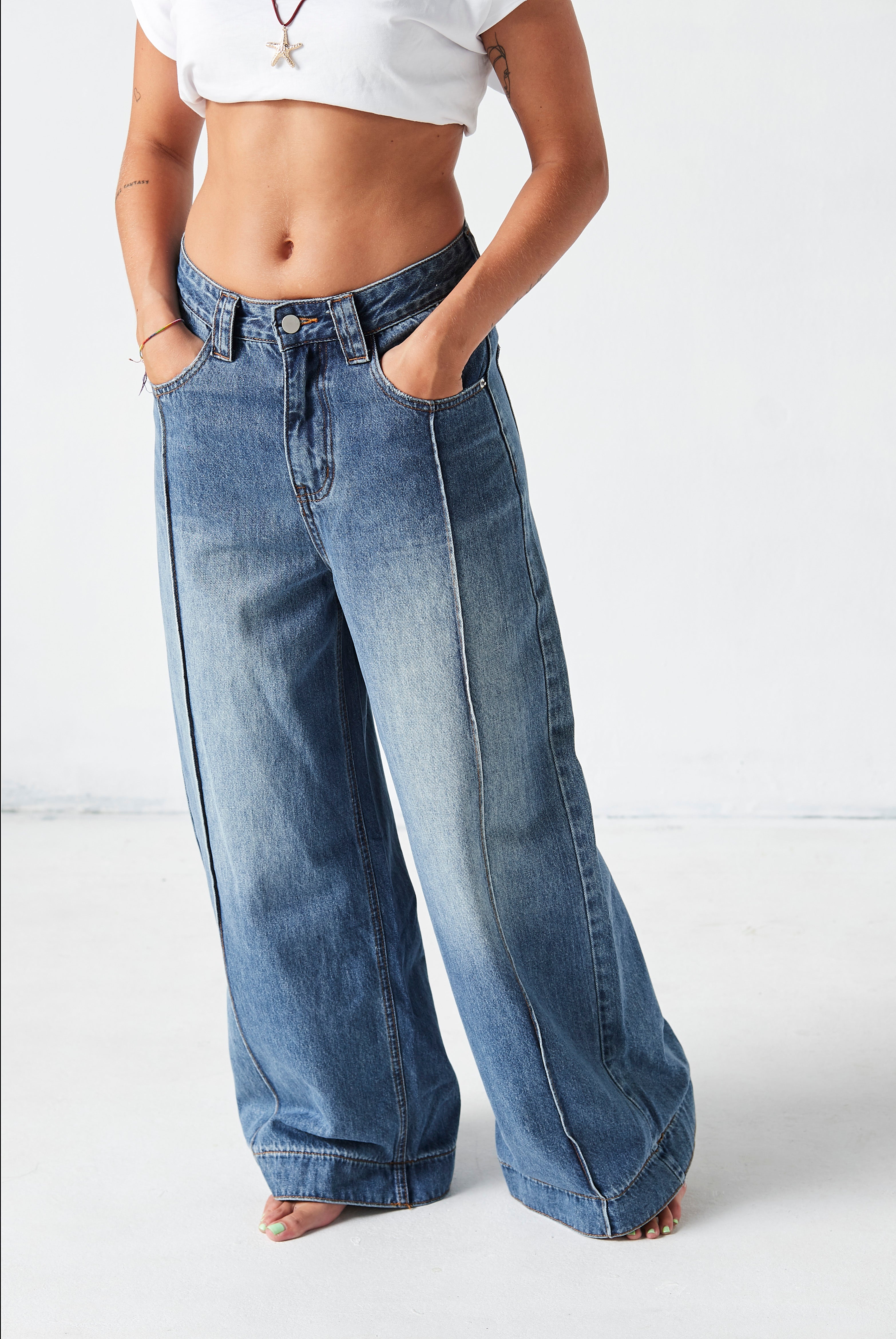 Vaquero ancho, costuras frontales. Bajo contraste.