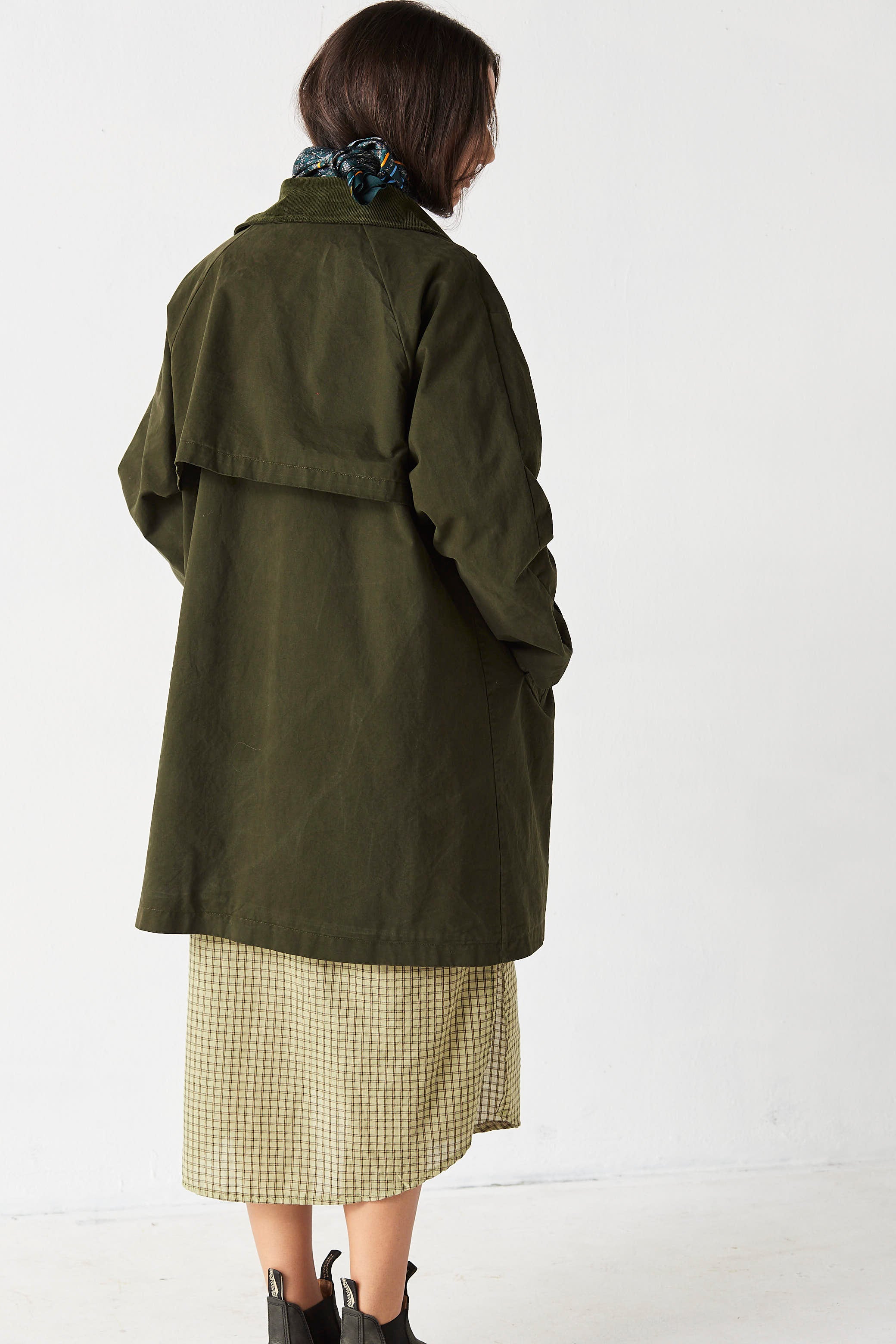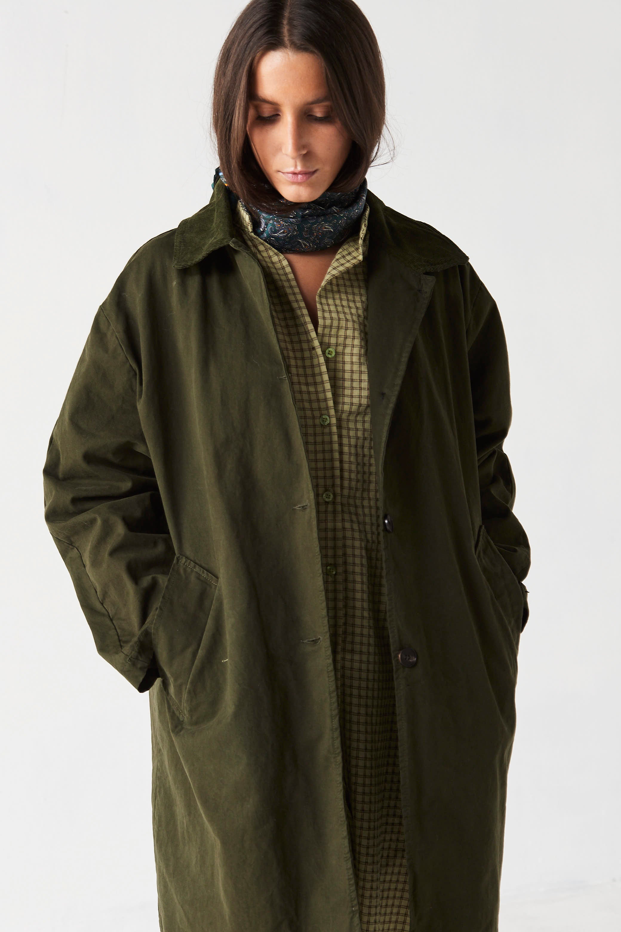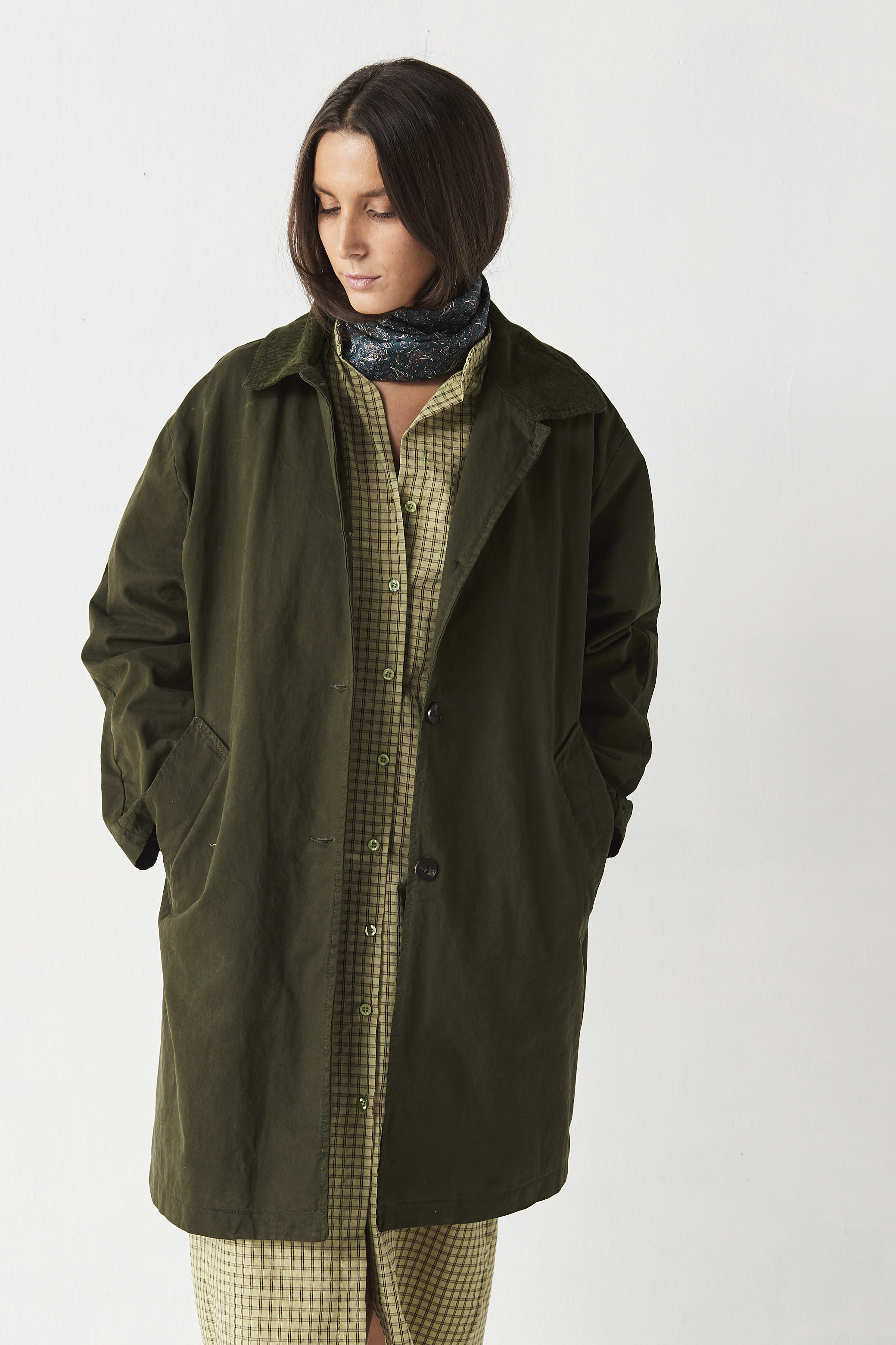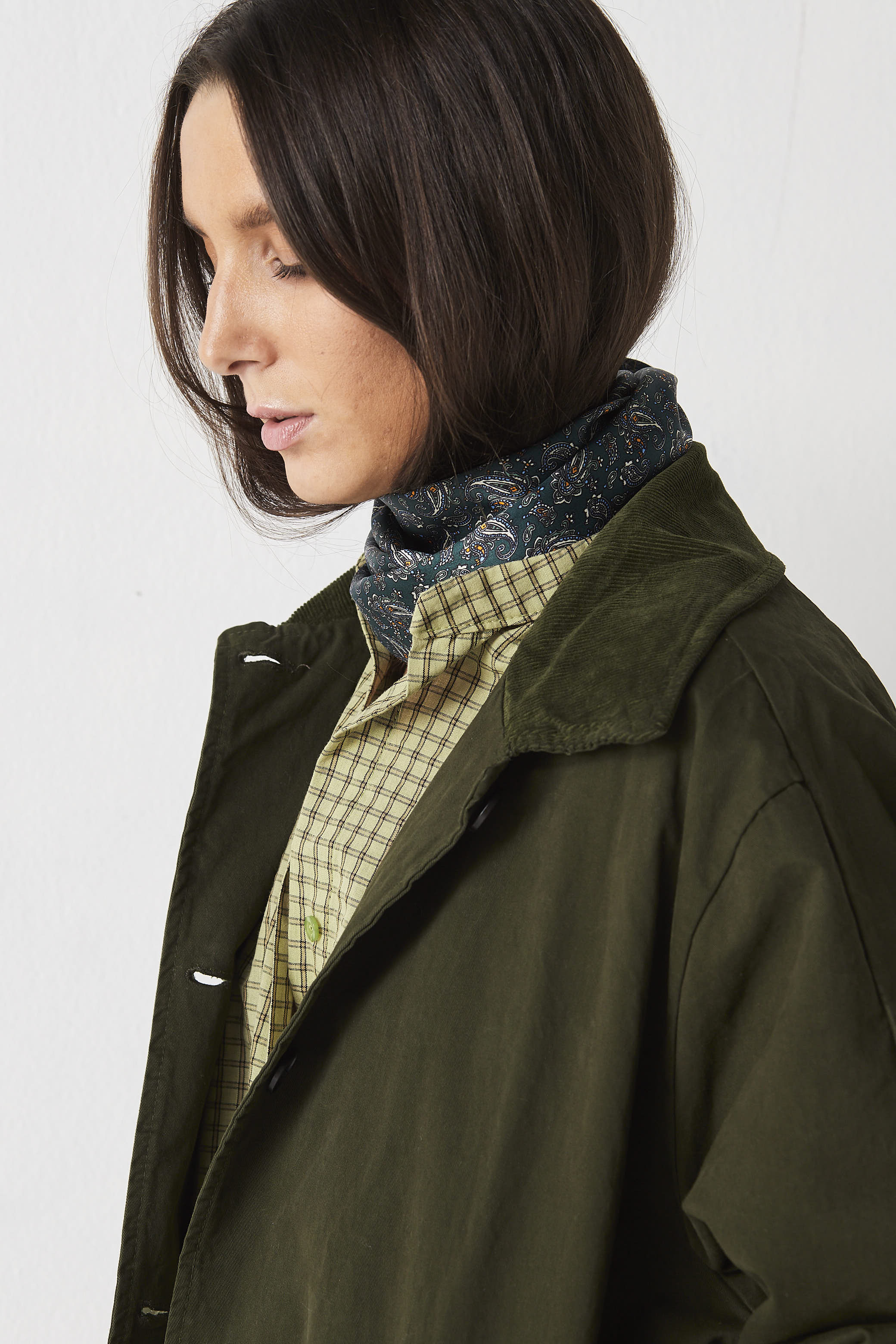 Parka tipo gabardina de algodón, cuello de pana. Forro interior de rayas.