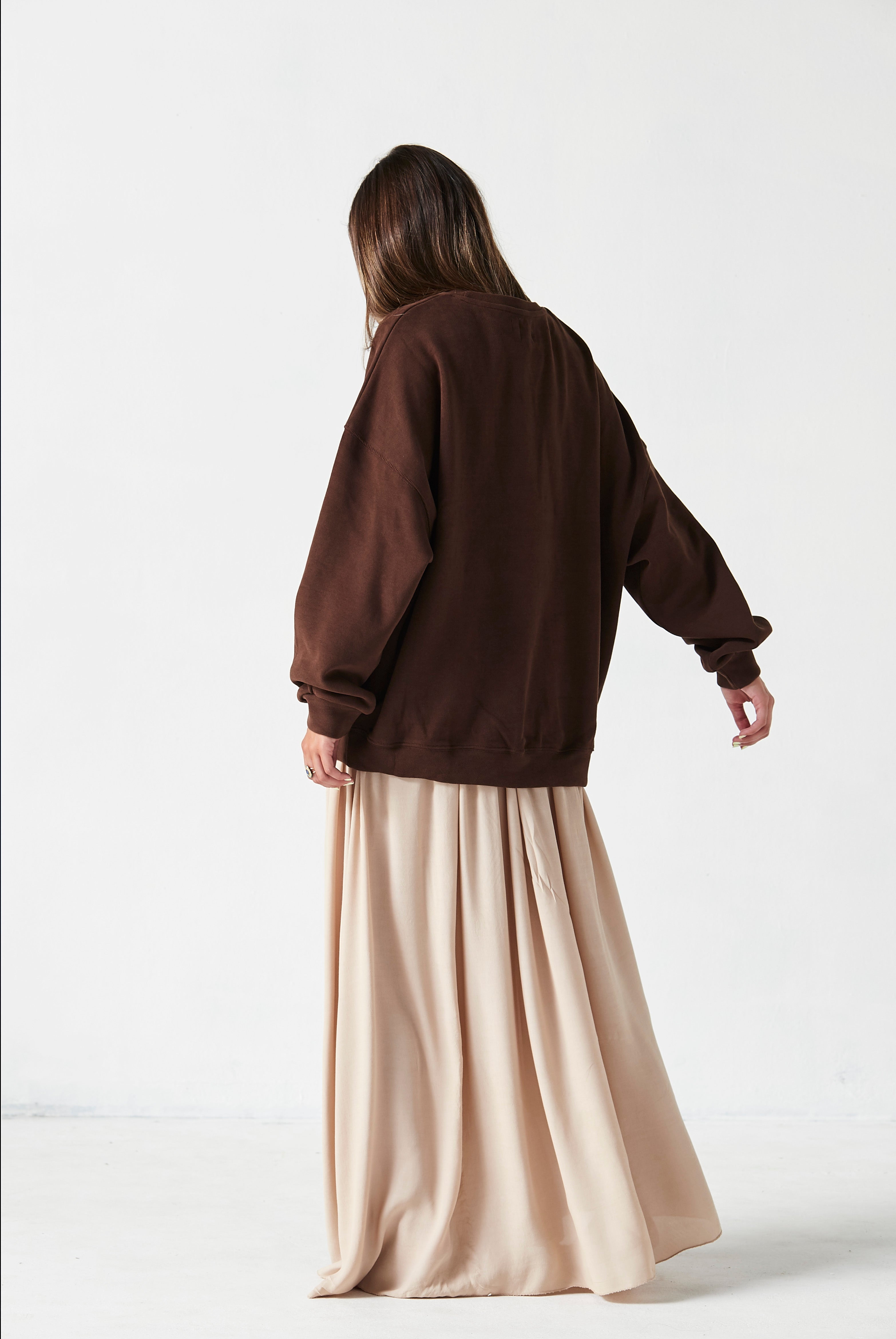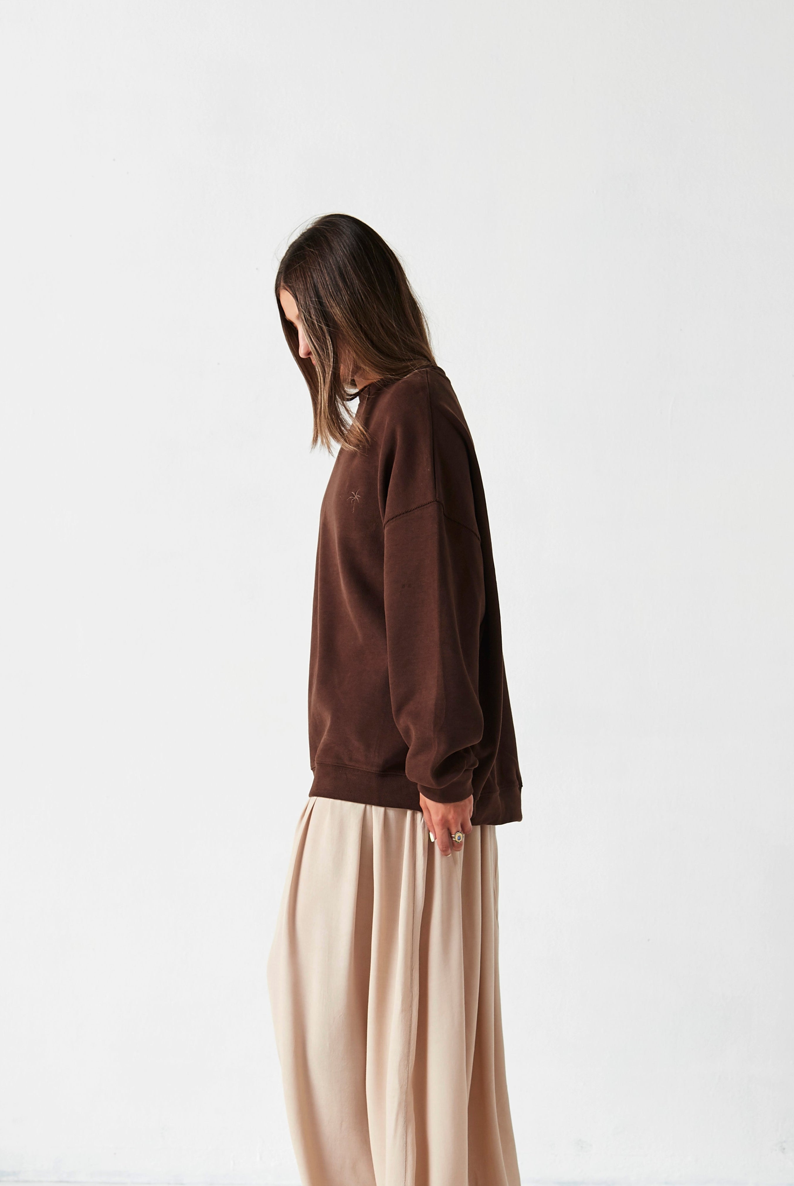 Sudadera oversized cuello redondo bordado palmera. Tejido algodón micro canalé.