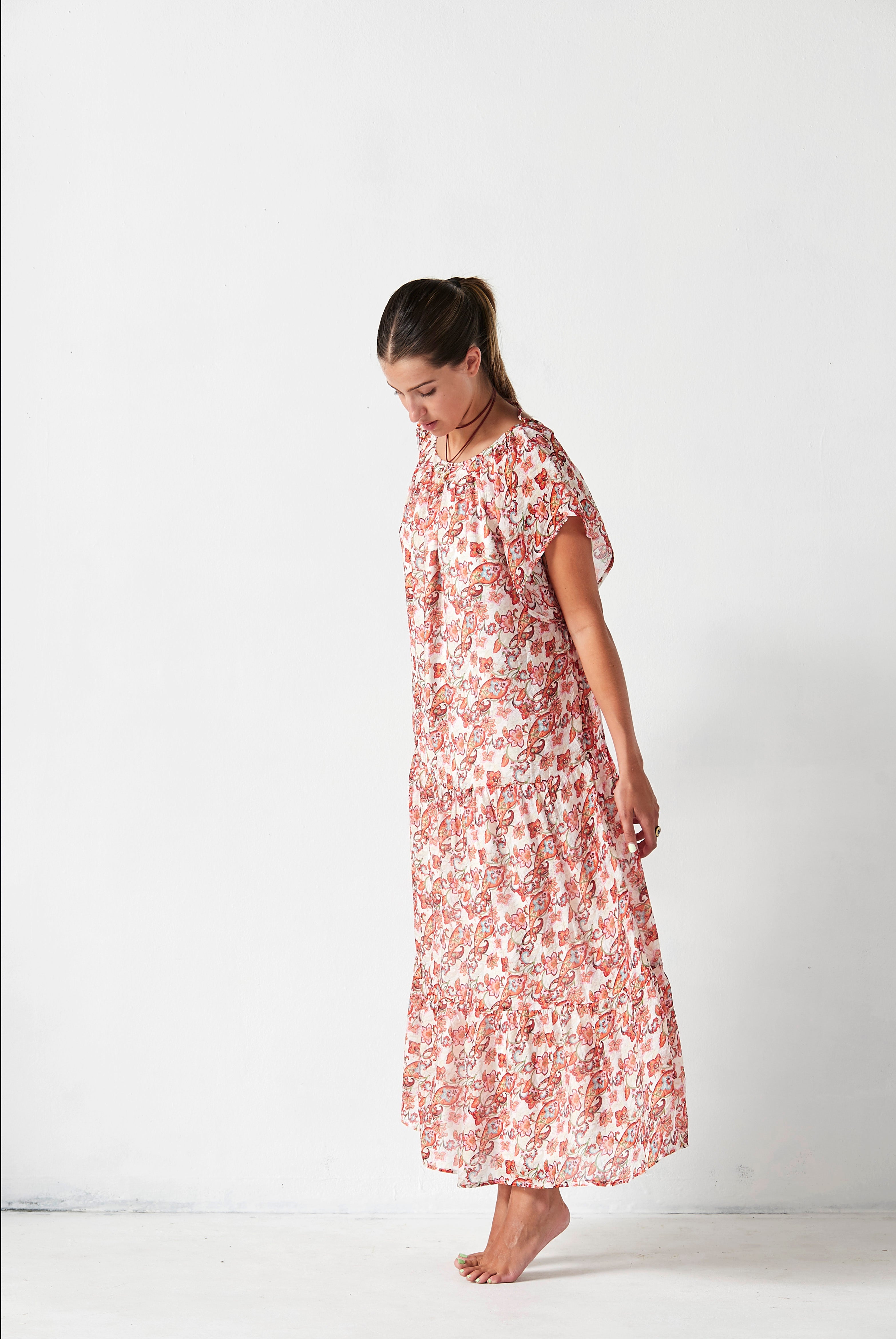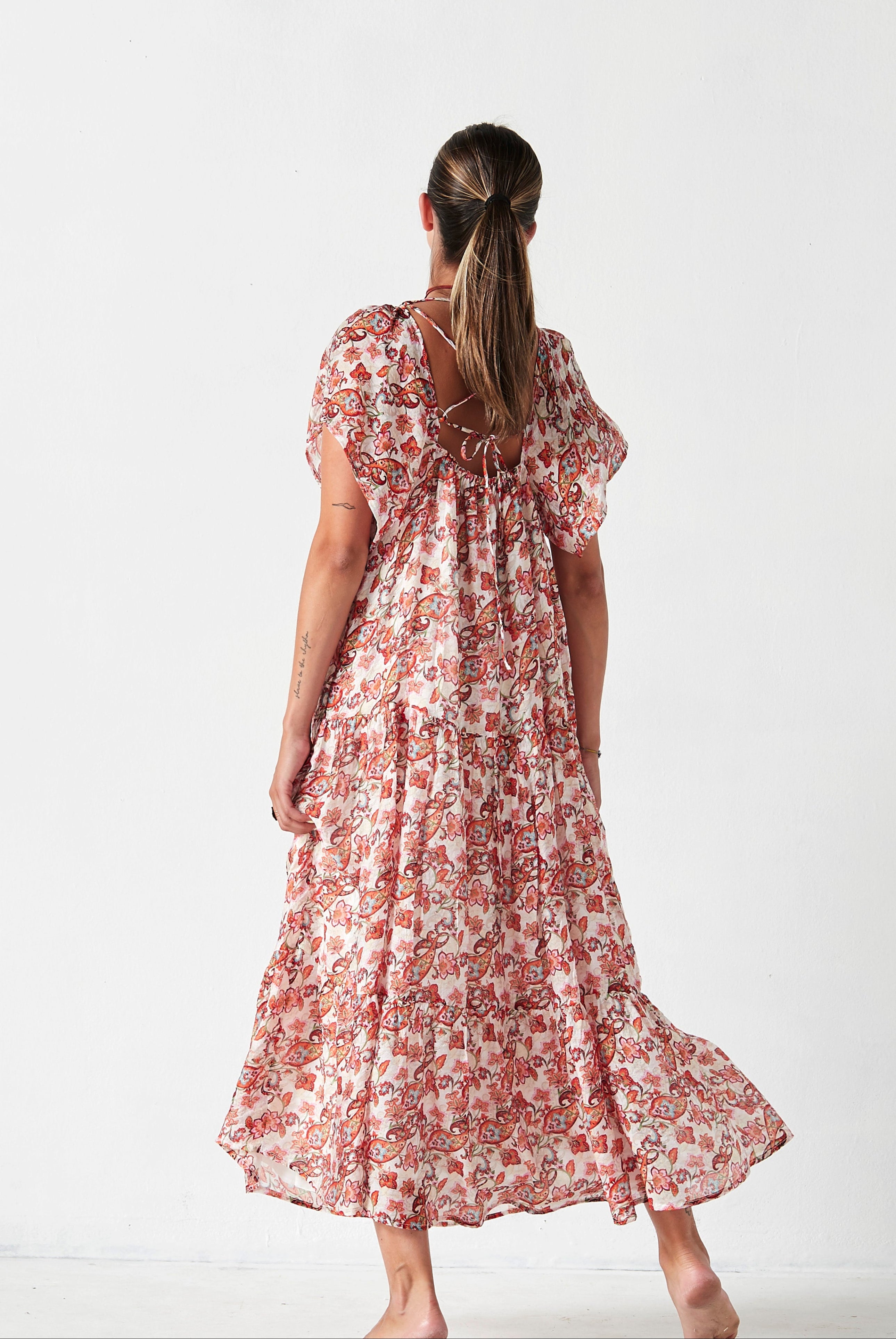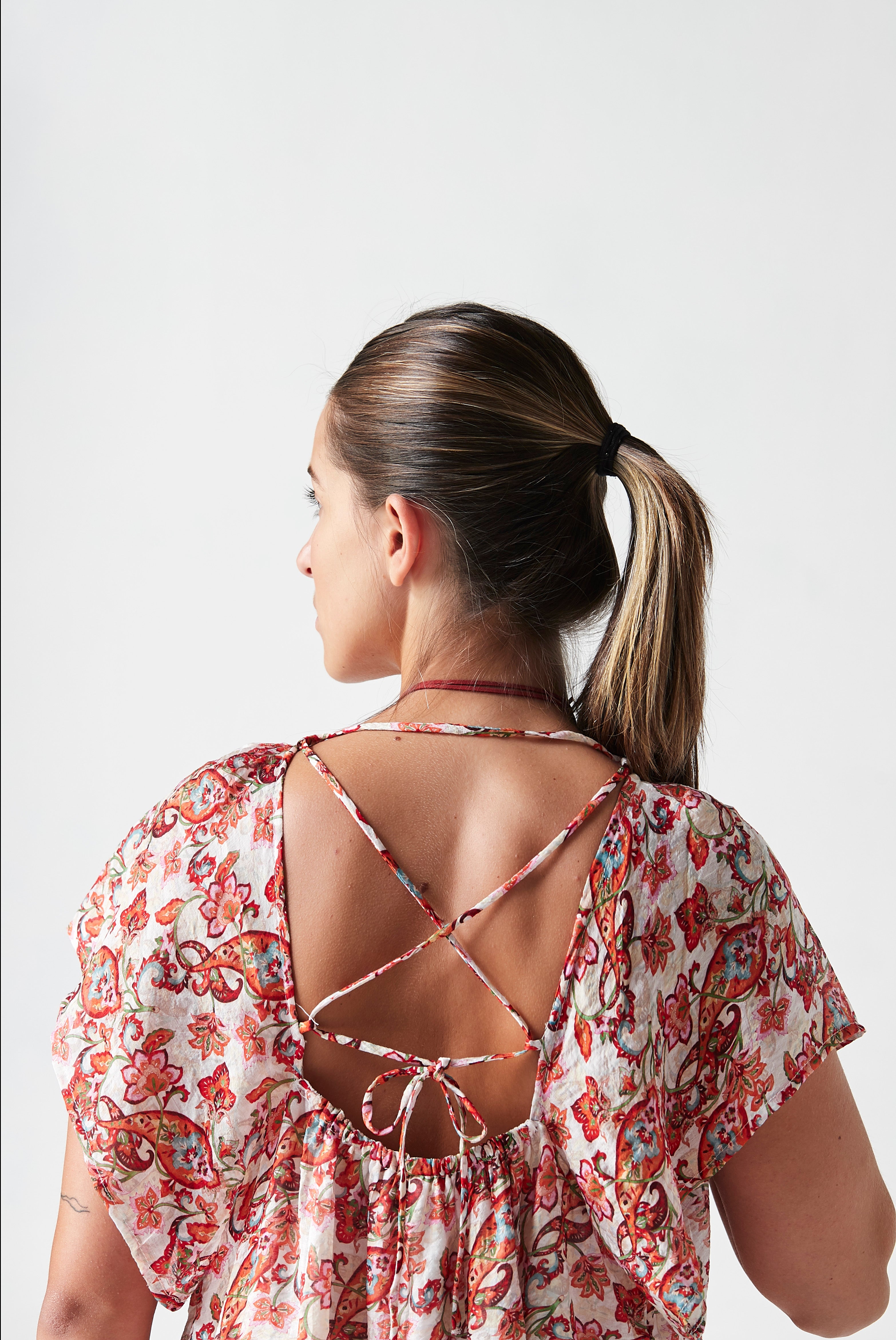 Vestido seda fluido. Manga abanico. Escote espalda con lazada. Forro algodón.