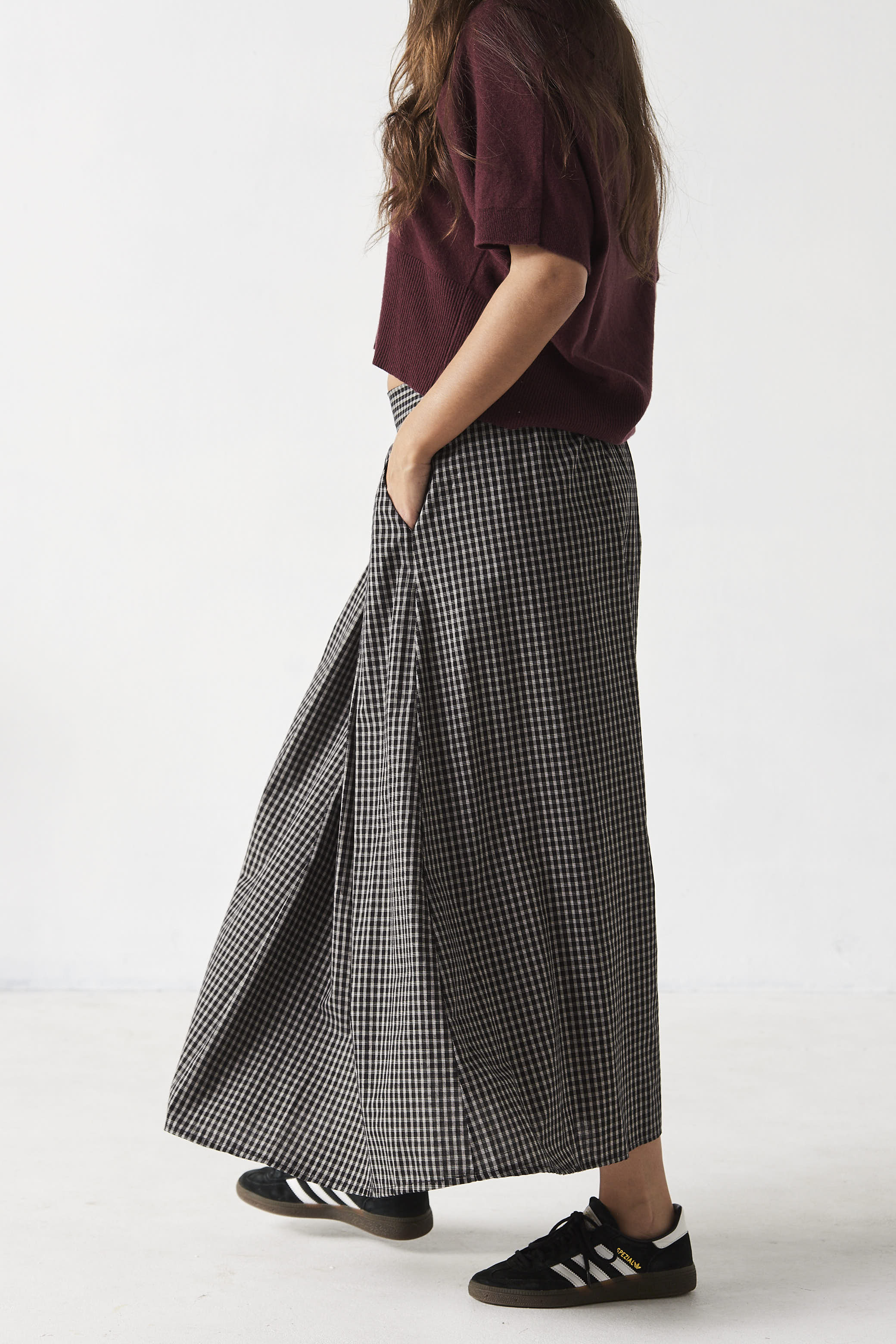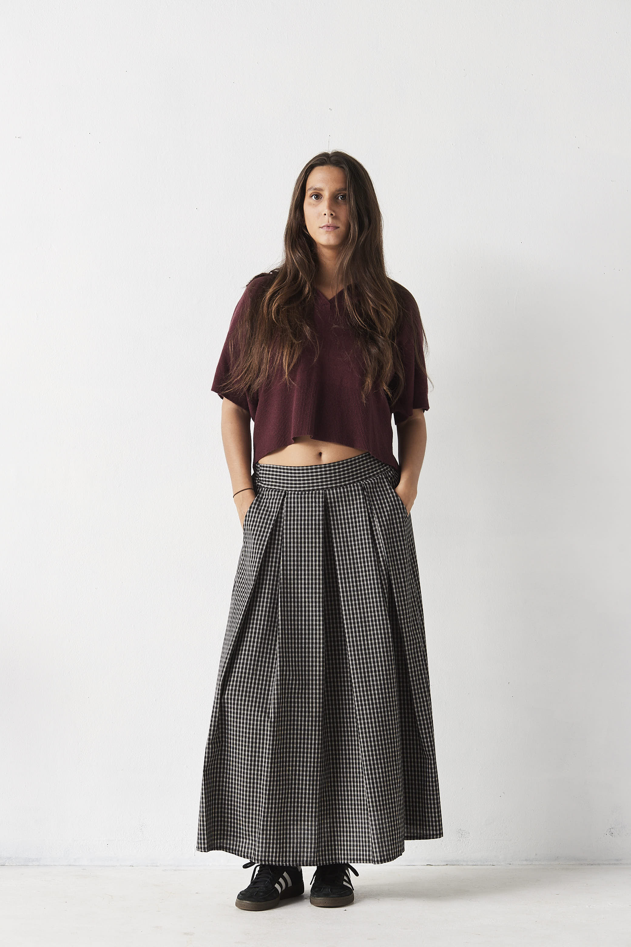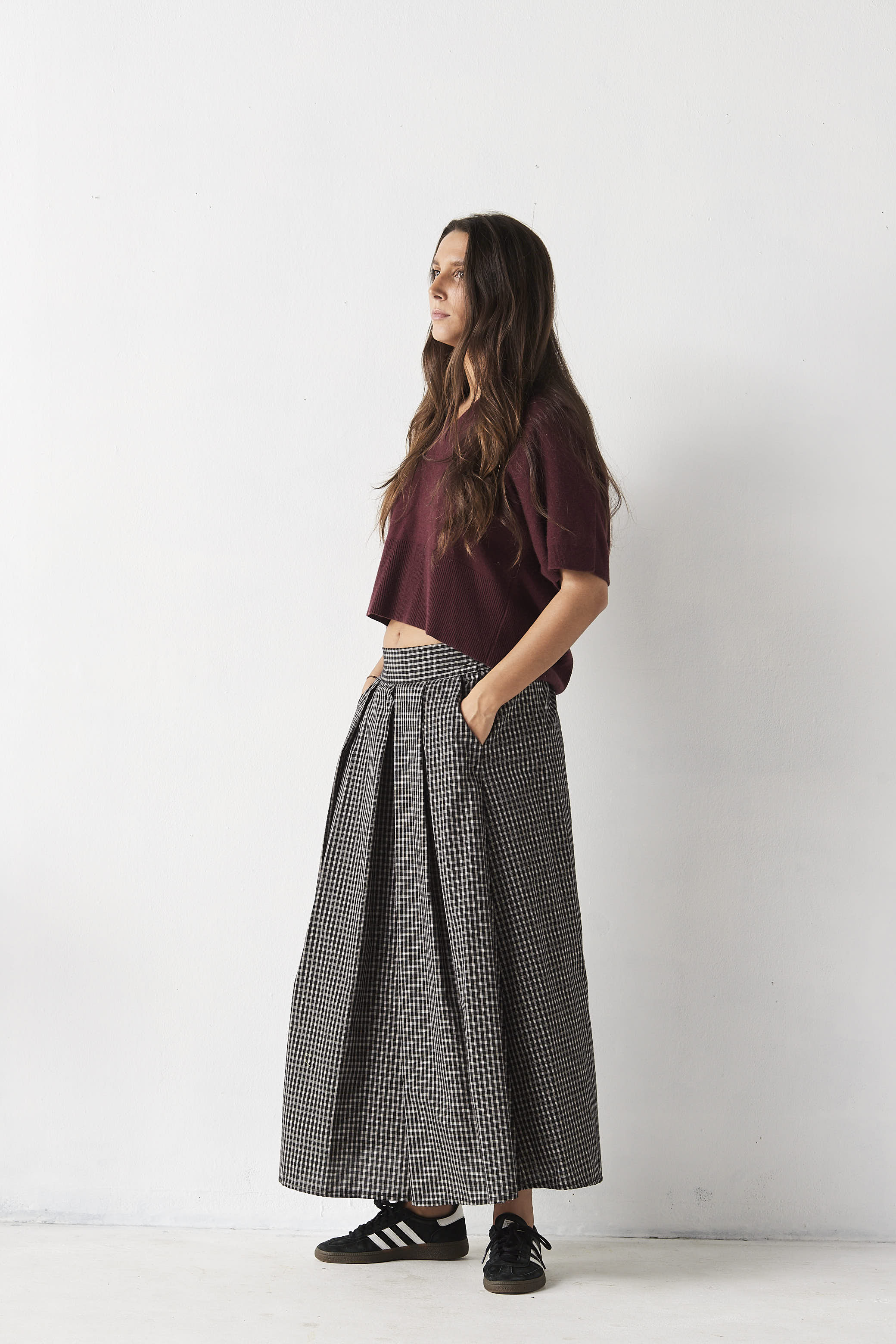 Falda de tablas algodón. Cuadro pequeño. Bolsillos laterales.