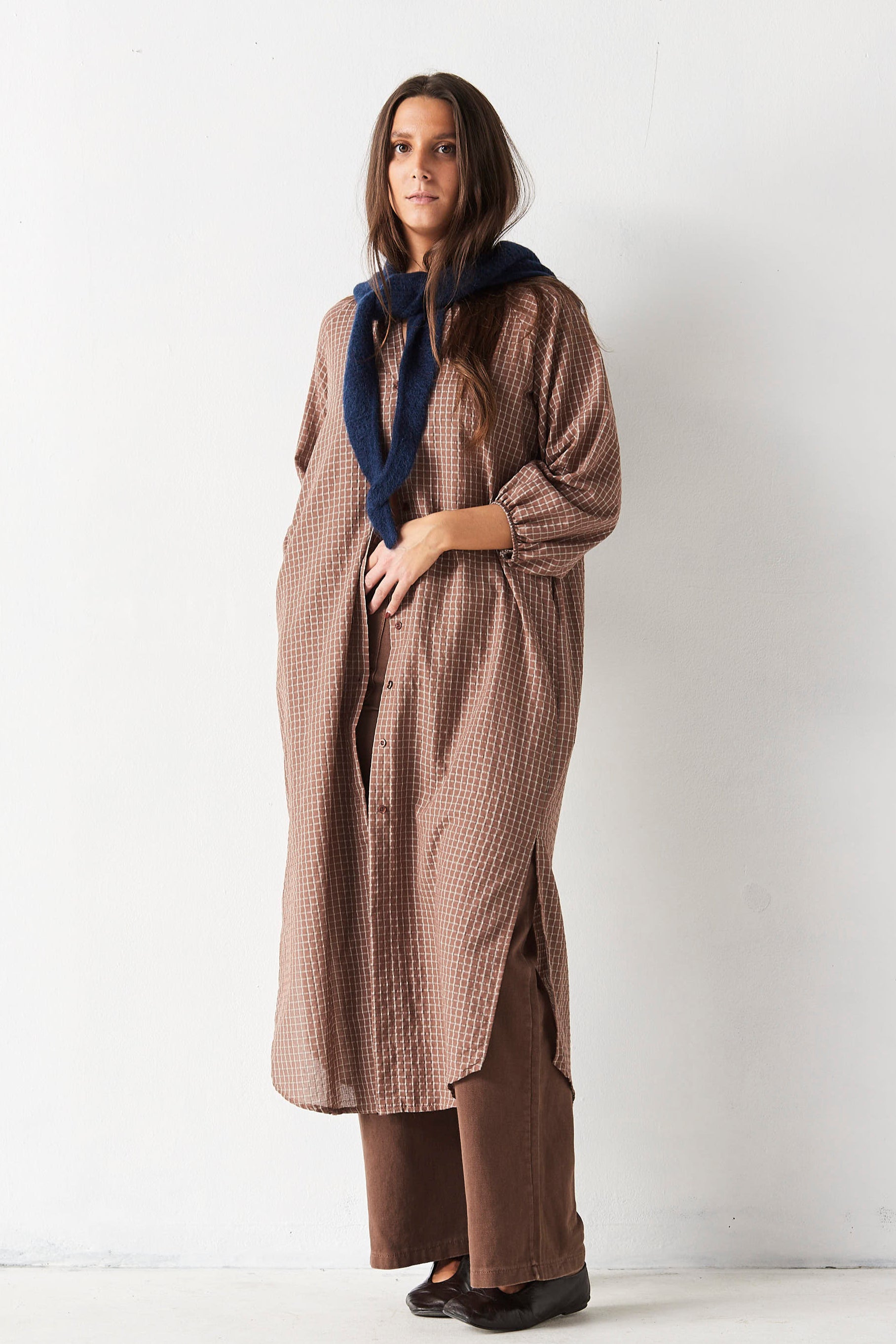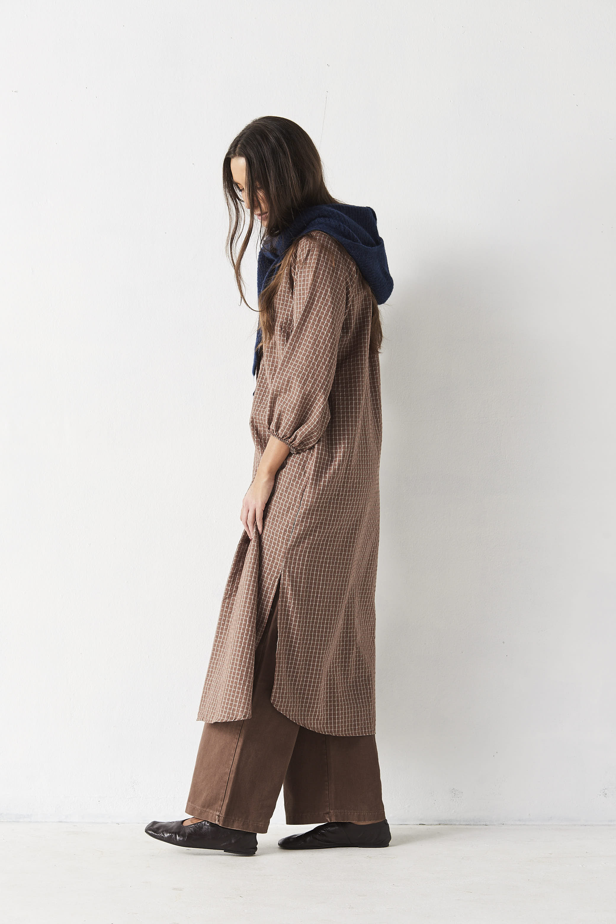 Vestido midi de cuadros abertura lateral y bolsillos. Botonadura delantera.